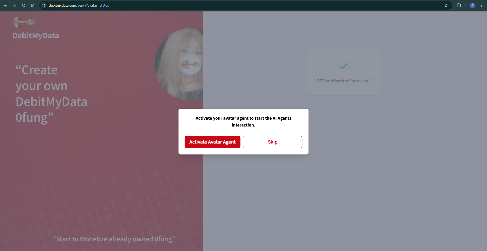 Once your wallet setup is complete, a Create Avatar Agent popup will appear. This is the first step in setting up your personalized digital identity.